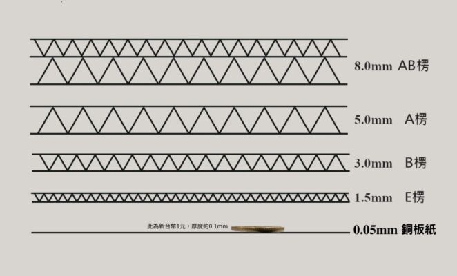 是台灣常見的瓦楞紙板中最薄的,不適合用來做大型運輸箱,經常用來做彩盒或是展示盒等,用來裝精巧的小物件,備料時間長,如無特殊需求,不建議用此材質。